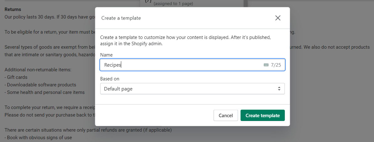 When you are in the "Create a Template" model, you can choose a label for this new template in the Name field. You then confirm that the Default Page is set for the "Based On" setting, and then you click on "Create Template."